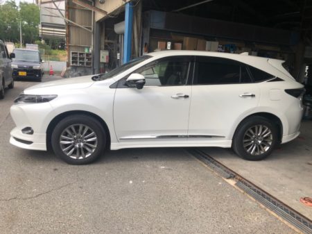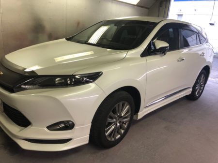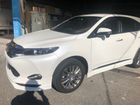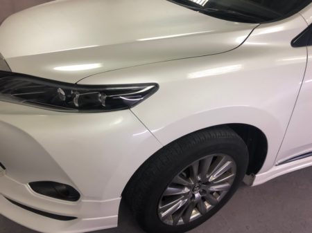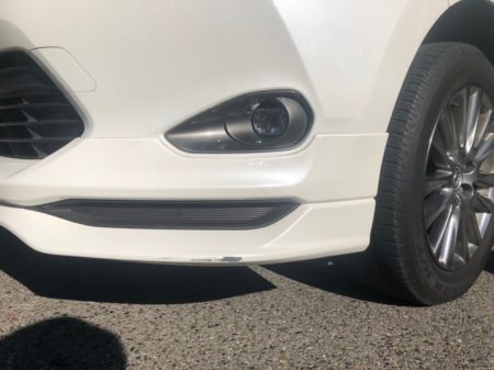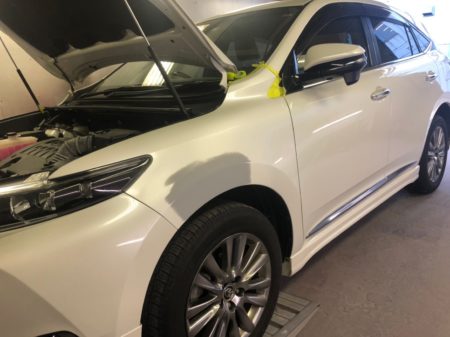 トヨタハリアーのフロントフェンダーのヘコミ及びフロントバンパー下部の傷の修理でご来店です。