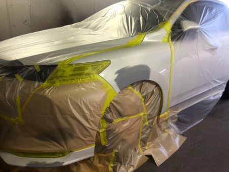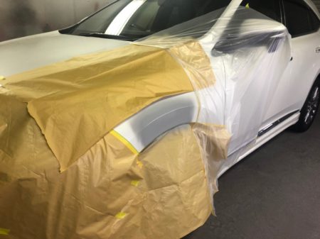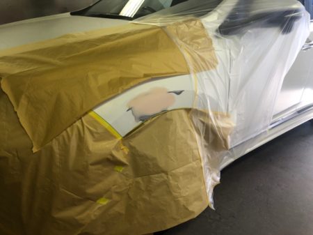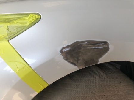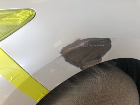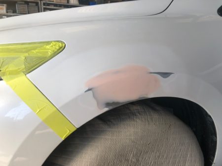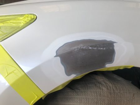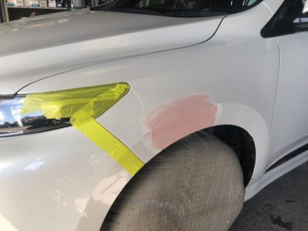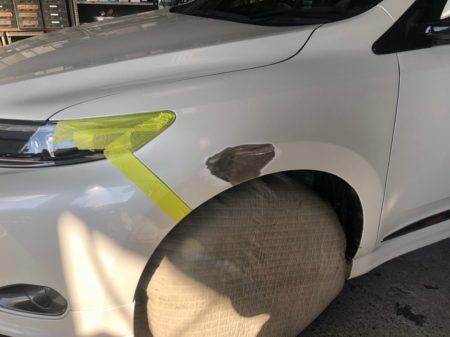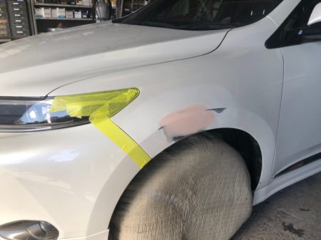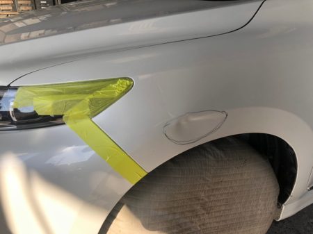 まずはフロントフェンダーの損傷部分にわかりやすくマーキングし