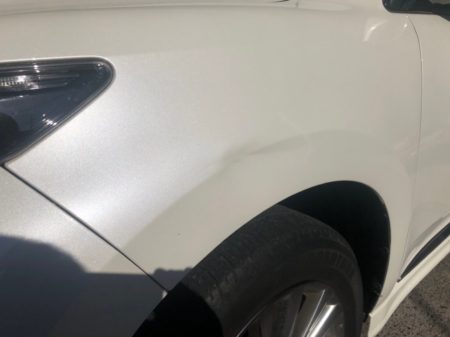 ホワイト系の色で屋外撮影の為、損傷部分がわかり辛いですがけっこうヘコんでます。