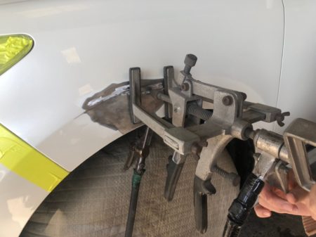 鉄板を剥き出しにする事によりスタッド溶接機でくっつけて引き出す事ができます。