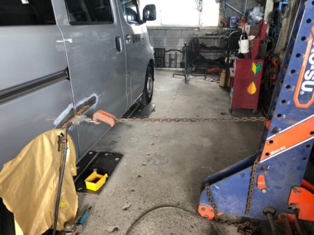 ▼ スタッド溶接が終わった時点で専用の引っ張り治具を取り付けて均等に引き出して修正をかけます。