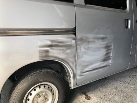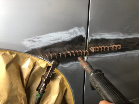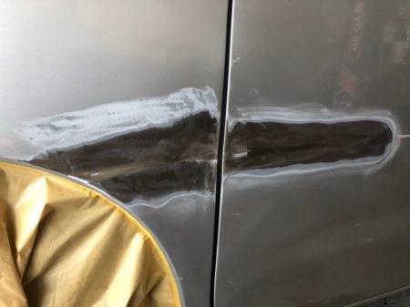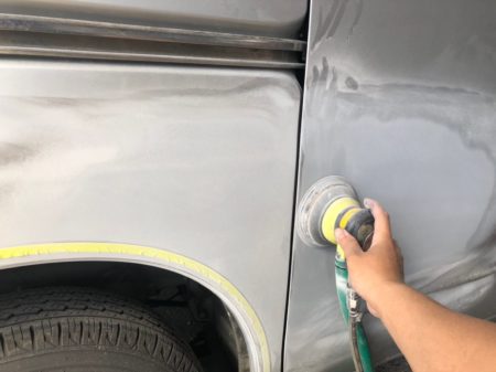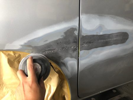 ▼ これから損傷したリアドア及びクオーターパネルの鈑金を行っていきますがまず、損傷部分をディスクサンダーで削って平滑に仕上げます。
