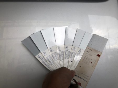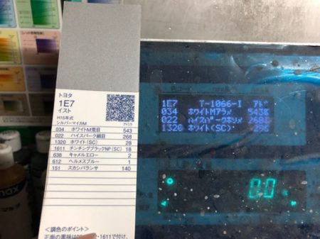 まず、メーカーのカラーコードから調合を調べて調色を決めていきます。