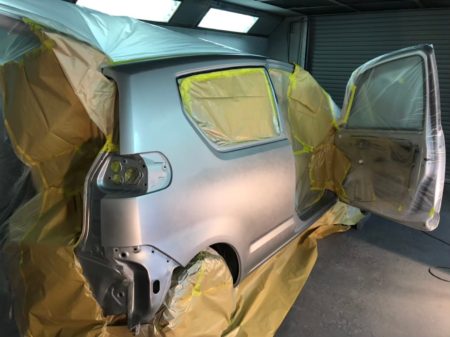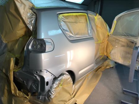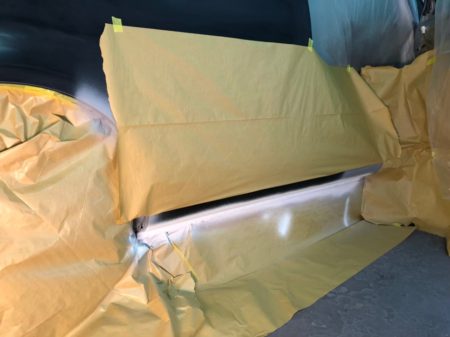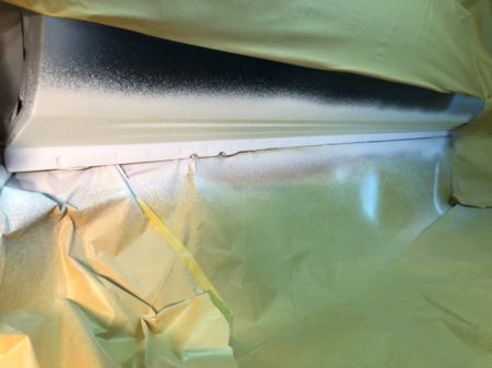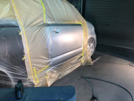 ▼シーラー乾燥後に上塗り塗装する為のマスキングをしシルバーカラーをムラにならない様に薄く数回に分けて塗装します。