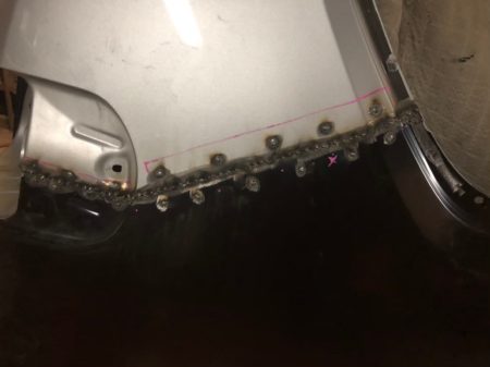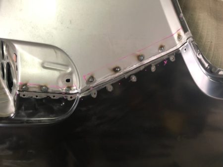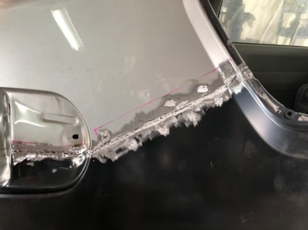 ▼車のパネルは、スポット溶接でくっついているのでクオーターパネルの溶接箇所を見つけて目視しやすい様にマーキングしていきます。
