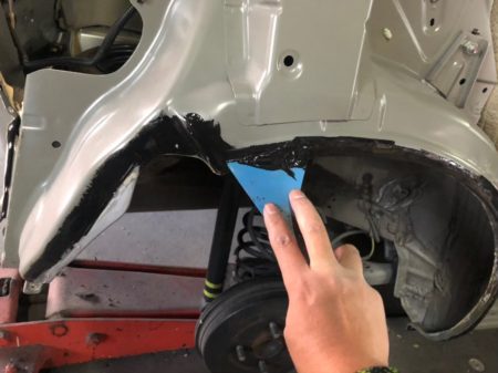 ▼溶接準備が整ったらタイヤハウス部分のアーチの所にはパネルボンドと言う接着剤を塗ります。