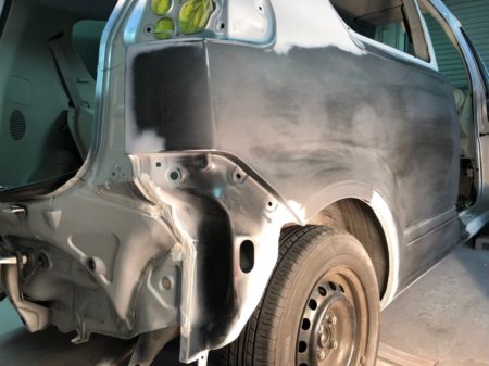 ▼同時にクオーターパネル切り継ぎ箇所もパテ付けし、研磨して形を整えていきます。