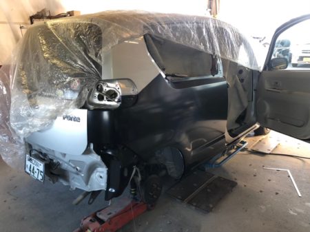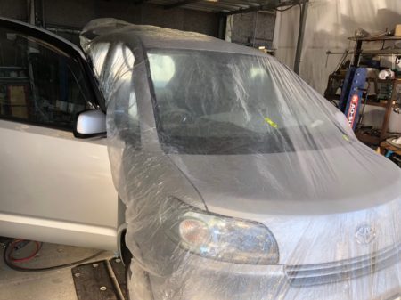 ▼ここからの作業は鉄粉が多く出ますので車全体を養生しています。