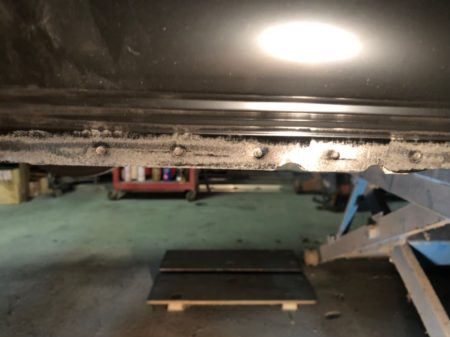 ▼サフェーサー乾燥後にサイドステップ下部に飛び石キズ防止の為のチッピングコートを塗装します。