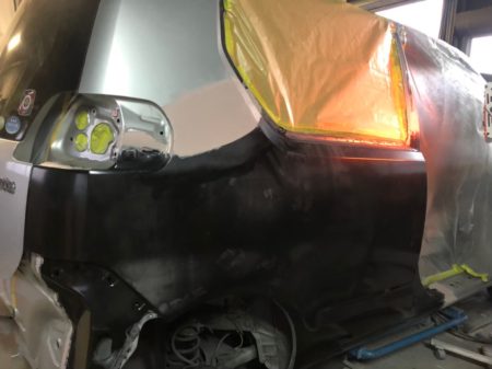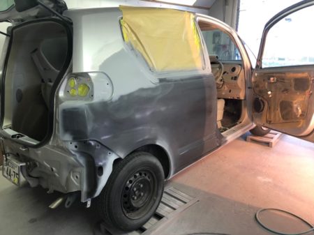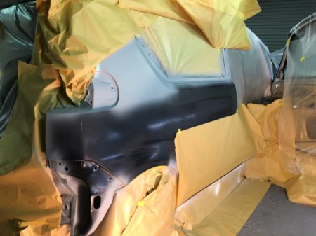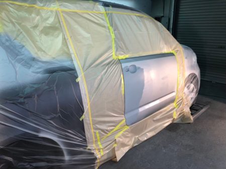 ▼塗装ブースに移動しマスキングしてサフェーサー塗装します。