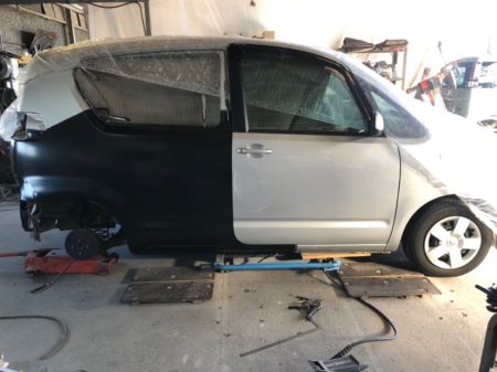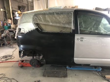 フロントドアは鈑金修理、クオーターパネルは取り替えで作業していきます。