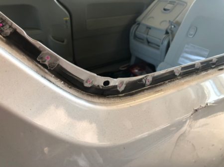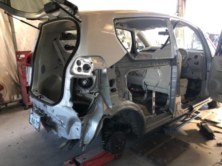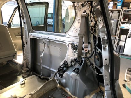 ▼クオーターパネル取り替えにあたり サイドガラス、リヤバンパー、リヤシート、