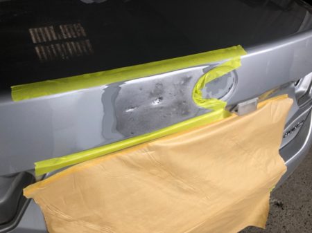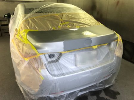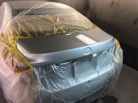 ▼サフェーサーを水研ぎ研磨してトランク全体を洗剤で足付けし上塗り塗装用のマスキングをします。