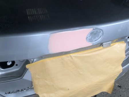 ▼鉄板を綺麗に元のラインまで復元出来たらサンドペーパーで研いで慣らし脱脂してからマスキングし鈑金パテを塗り付けていきます。