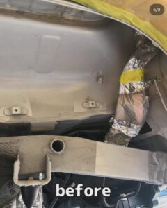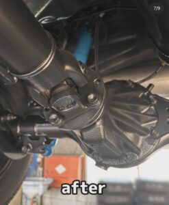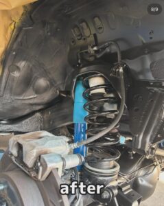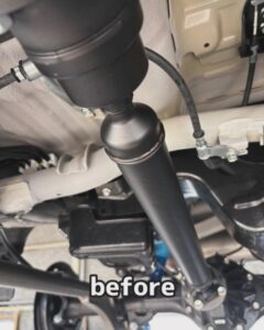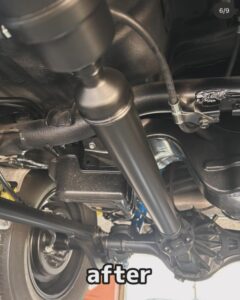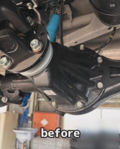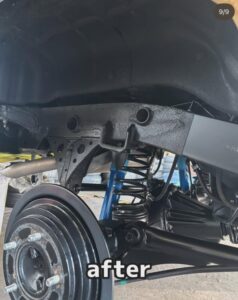 今回はリフトアップし、フレーム・アクスル・足回り各部を入念に確認。付着した汚れや既存のサビを丁寧に除去した後、防錆性能の高い塗料を使用して塗装を行いました。細部までしっかり塗り込むことで、今後のサビ発生や進行を抑える効果が期待できます。