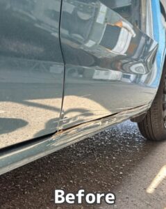 Before: ロッカーパネルに深い凹みと傷。塗装が剥がれ、パネル自体が変形しているため、板金(叩き出し)では対応できない交換レベルの損傷です。