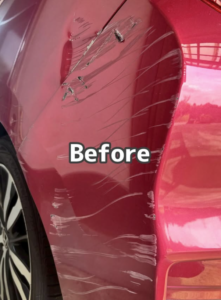 Before: クォーターパネルに深い傷とえぐれ、リアバンパーにも広範囲の擦り傷がある状態です。