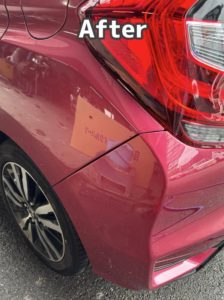 ホンダ・フィットのレッド系メタリック。右クォーターパネルの板金修理とリアバンパーの交換を行い、塗装で仕上げた施工です。