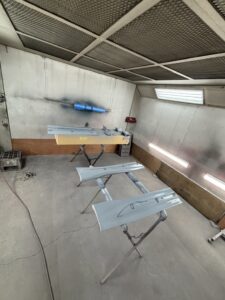 ブース内に全パーツを並べて、均一に乾燥させている様子です。乾燥後は表面を確認し、必要に応じて磨き上げてから車両への取り付けに進みます。