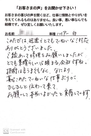 修理でのご来店ありがとうございました。 迅速丁寧、心温まるなどの感謝のお言葉をいただき私をはじめ作業に携わった従業員も 恐悦至極です。これからも真心を込めた仕事を心がけて行きます。 今後もよろしくお願いいたします。 &n ... 小野田市からご来店.ハリアー板金塗装修理したお客様の感想