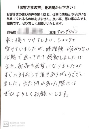 LINEを使ってのお見積もりをし、ご入庫いただきました。その際写真ではわかり辛い部分のパーツが破損しており 追加注文になってしまいご迷惑をおかけいたしました。 パーツ破損を確認してからは出来る限り迅速にお客様へのご連絡と ... 宇部市からおこしのお客様の声 アテンザワゴン キズヘコミ修理板金塗装